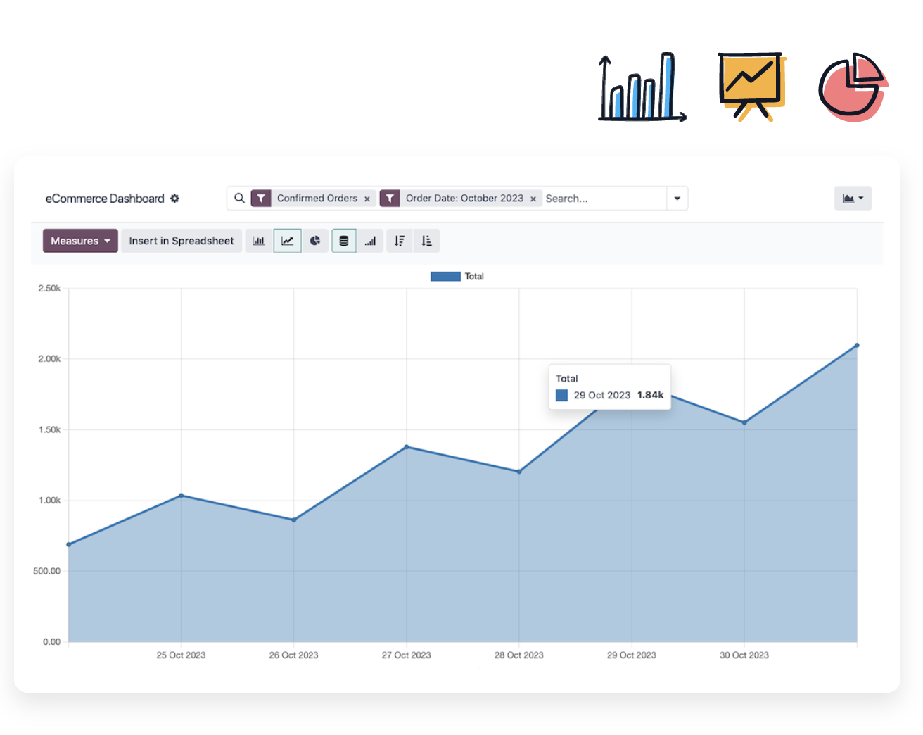 Sustainable growth. Odoo is designed to help you reach just the right audience and scale up as you go. Use the built-in dashboard to build advanced reports and cross-check data.