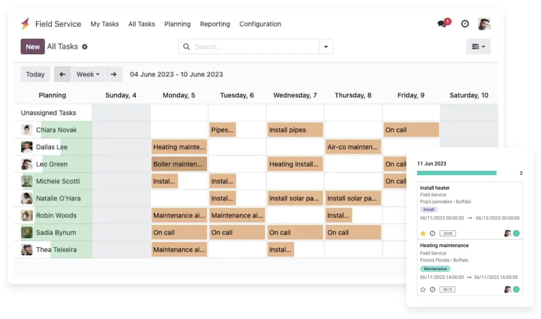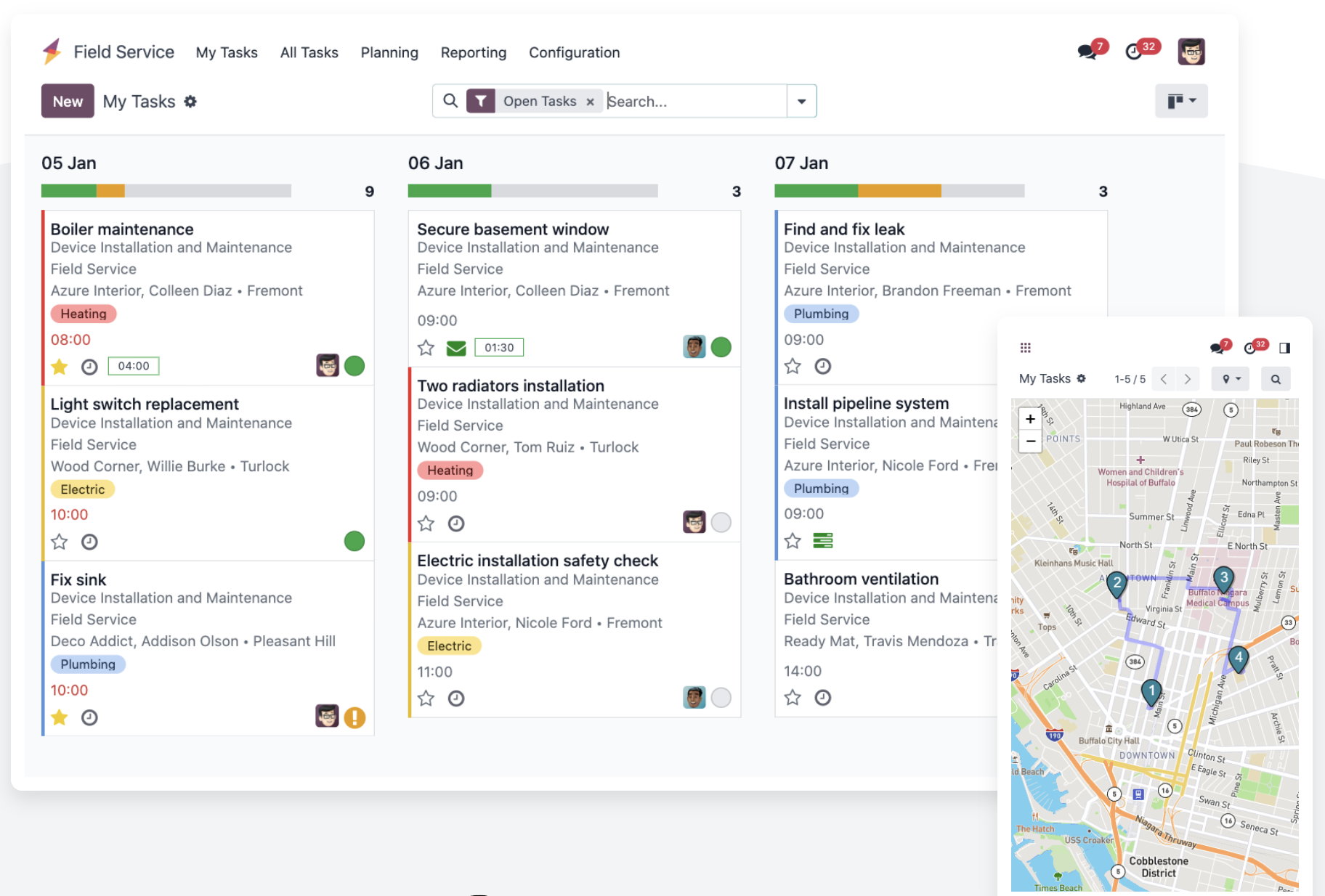 Odoo is the ultimate solution for your field service business. Organize your team's agenda, manage onsite work, and enjoy the simplicity of integrated timesheets and invoices.