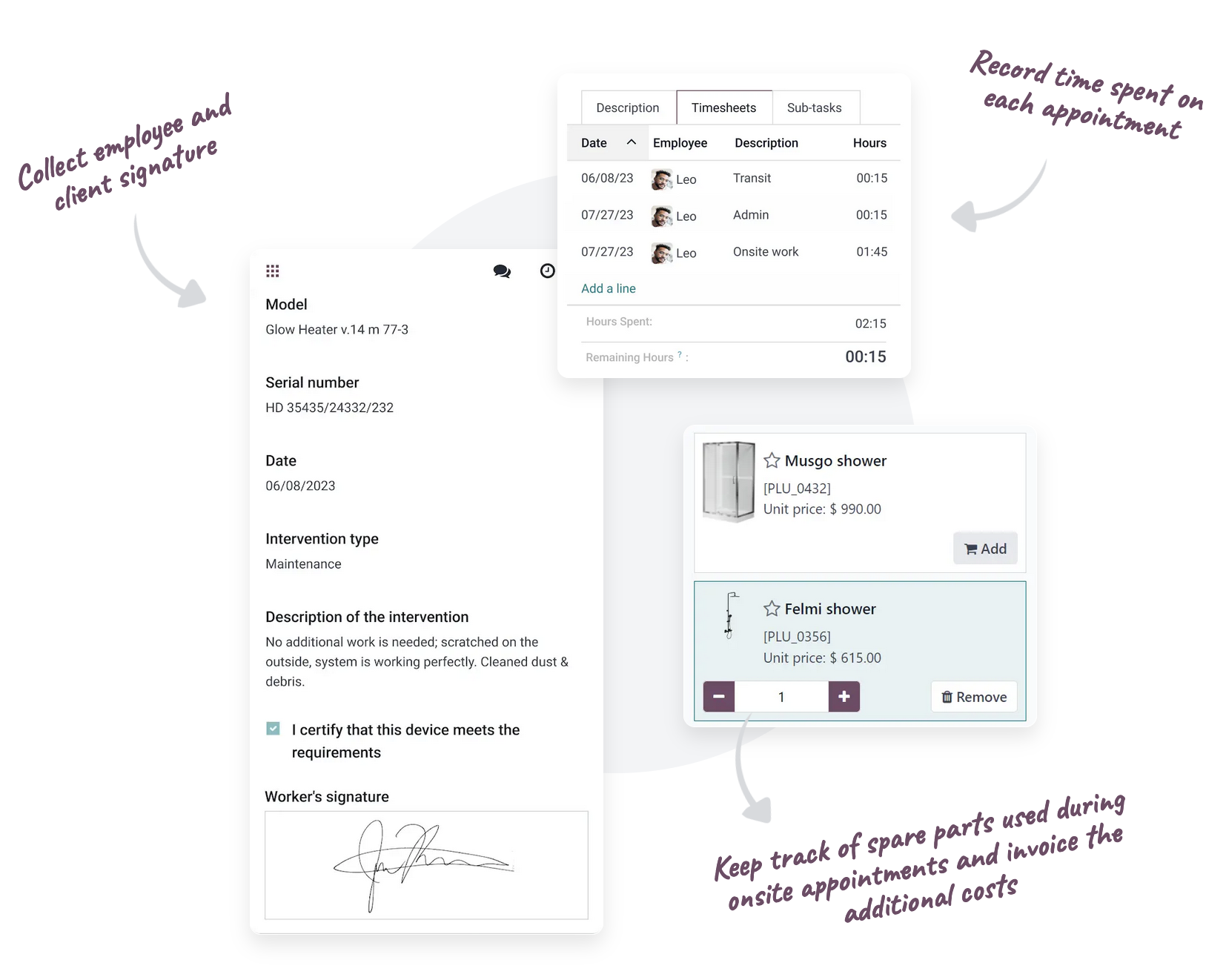 Everything you need is in your pocket. Odoo's powerful mobile app allows you to manage any appointment end-to-end, from filling in the worksheet to keeping your stock up to date.