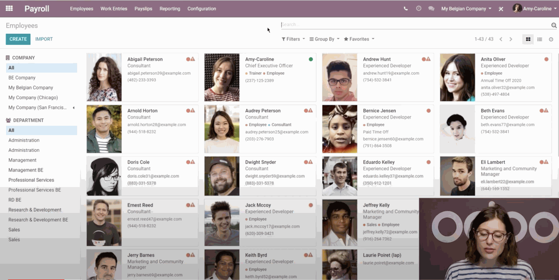 Payroll works in conjunction with other Odoo apps, such as Employees, Time Off, Attendances, and Planning.