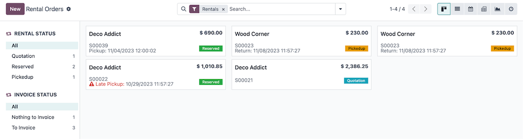 View a breakdown of rental orders, including pickup dates and times. Orders are tagged with “Quotation” or “Reserved” based on status. Products that are past pickup or drop off time are tagged with a warning.
