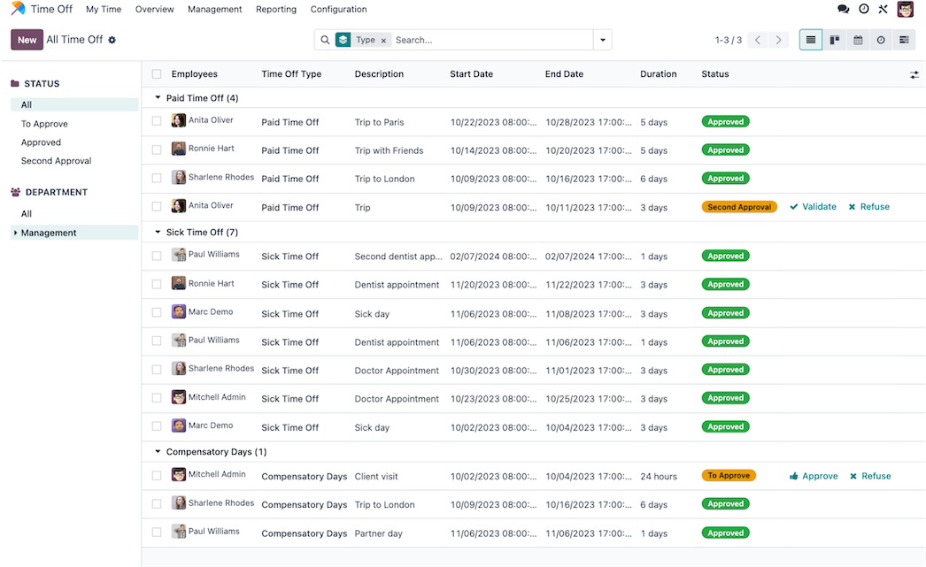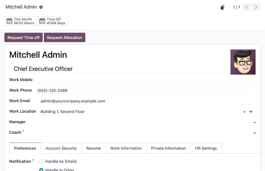 From allocation to request to approval, make every step of the time off process easy and transparent with Odoo's Time Off application.
