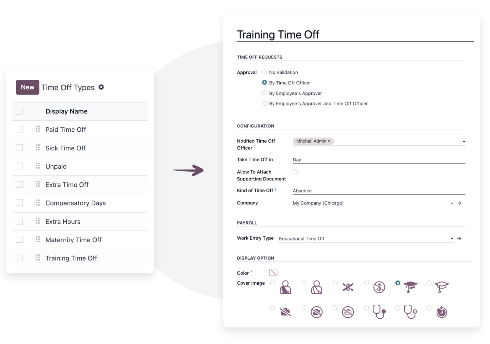 Choose an icon and color to distinguish this time off type when it is displayed throughout the Time Off application.